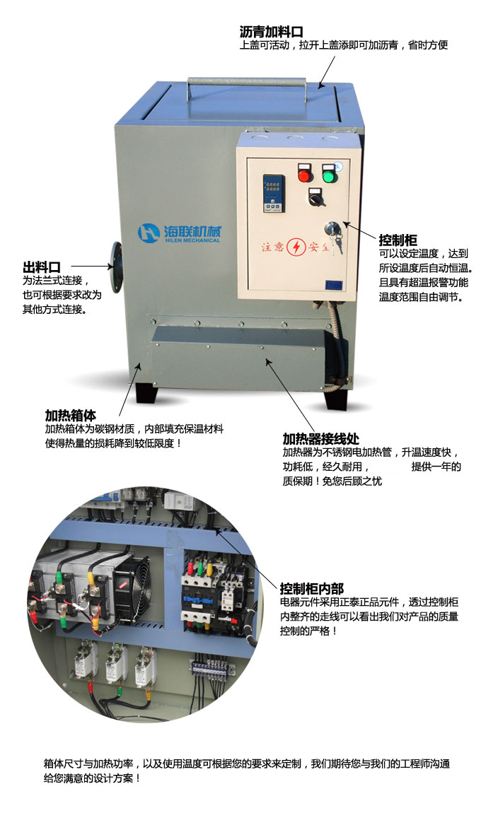 瀝青電加熱器具有加熱速度快、加熱均勻、環(huán)保等特點。具體加熱功率根據(jù)客戶需要定制。