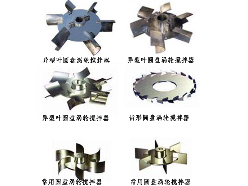 常用圓盤渦輪式攪拌器較之開啟渦輪式攪拌器,基本流型相同,同樣具有高剪切能力和較大的循環(huán)能力,區(qū)別在于中部多一圓盤,下面可以存一些氣體,使氣體分散更平穩(wěn),所以在氣體分散吸收過程中,它是很適合的。斜葉具有傾角,有軸向分流:彎葉具有后角,排出性能好,動力消耗低;螺距葉既有傾角又有后角,流型和性能部分差異。常用介質粘度μ<5×104cP,常用運轉速度n=10-300rpm,v=4-10m/s, 高轉速可達600rpm,常用尺寸DJ:L:b=20:5:4,DJ/D=0.2-0.5,斜葉傾角45°,60°,后彎角=45°。